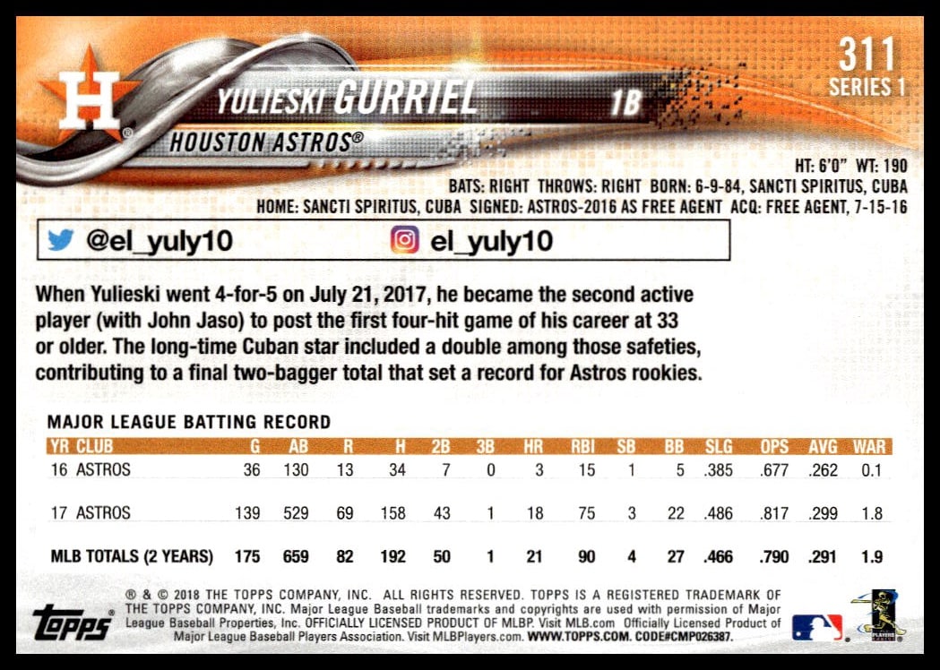 This BaseballΒ card, from 2018 is part of the Topps Series 1Β card set. Yulieski Gurriel is featured and has a card number of 311.