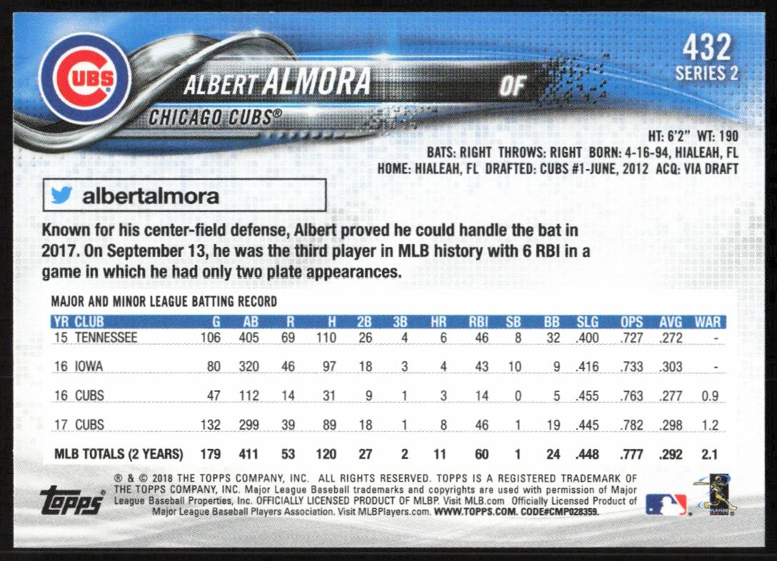 This BaseballΒ card, from 2018 is part of the Topps Series 2Β card set. Albert Almora is featured and has a card number of 432.