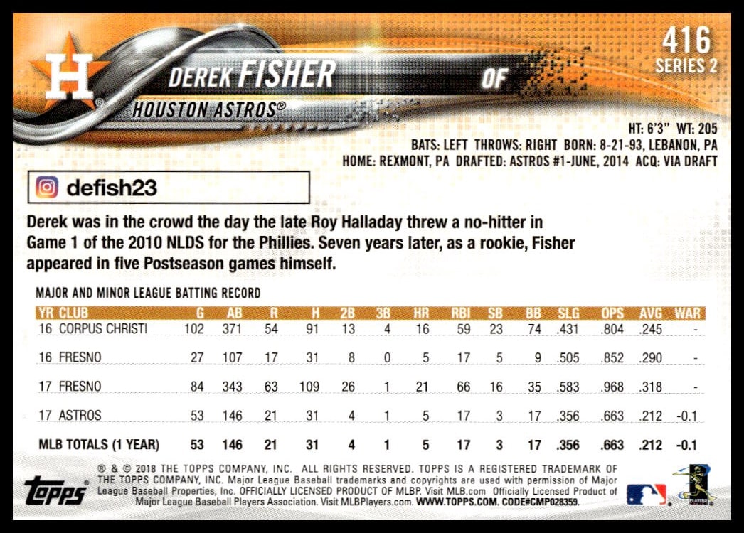 This BaseballΒ card, from 2018 is part of the Topps Series 2Β card set. Derek Fisher is featured and has a card number of 416.