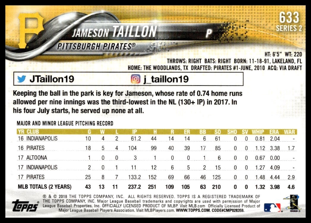 This BaseballΒ card, from 2018 is part of the Topps Series 2Β card set. Jameson Taillon is featured and has a card number of 633.