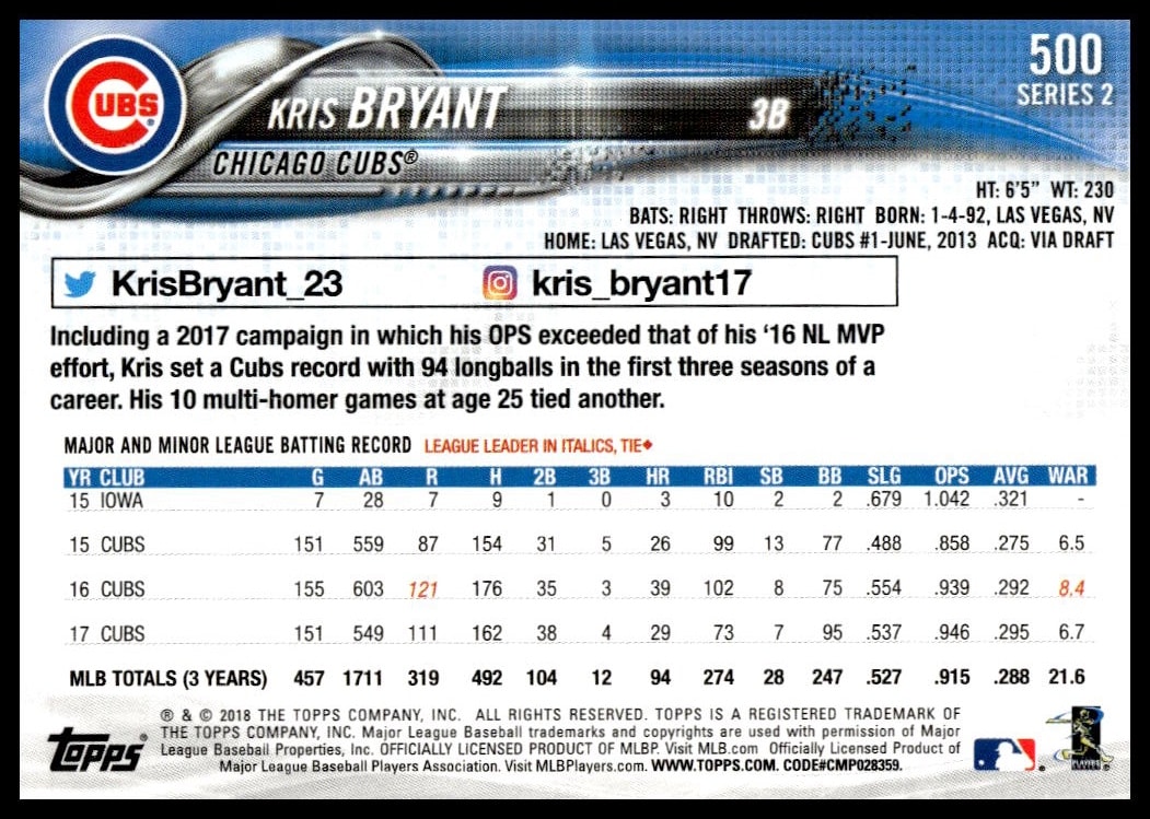 This BaseballΒ card, from 2018 is part of the Topps Series 2Β card set. Kris Bryant is featured and has a card number of 500.