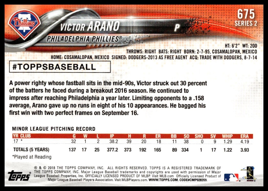 This Baseball card, from 2018 is part of the Topps Series 2 card set. Victor Arano is featured and has a card number of 675.