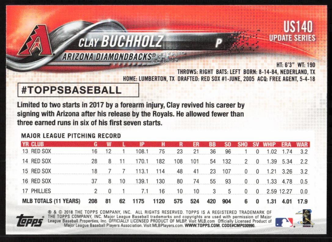 This BaseballΒ card, from 2018 is part of the Topps UpdateΒ card set. Clay Buchholz is featured and has a card number of US140.