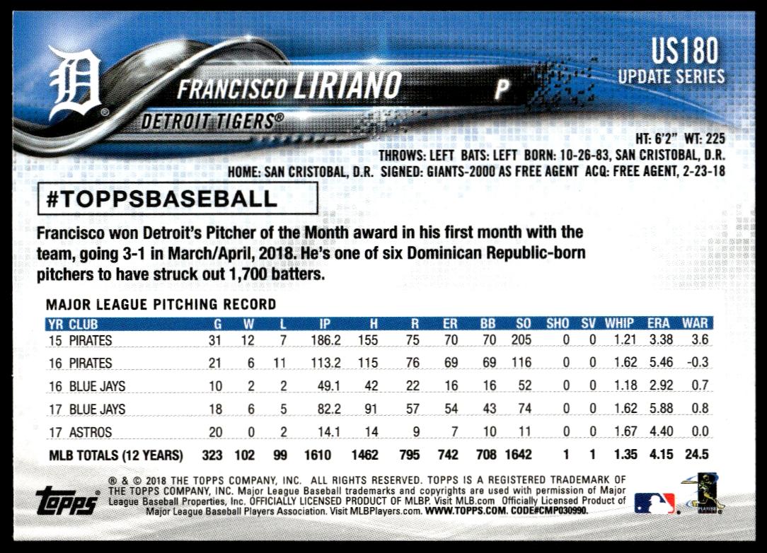 This BaseballΒ card, from 2018 is part of the Topps UpdateΒ card set. Francisco Liriano is featured and has a card number of US180.