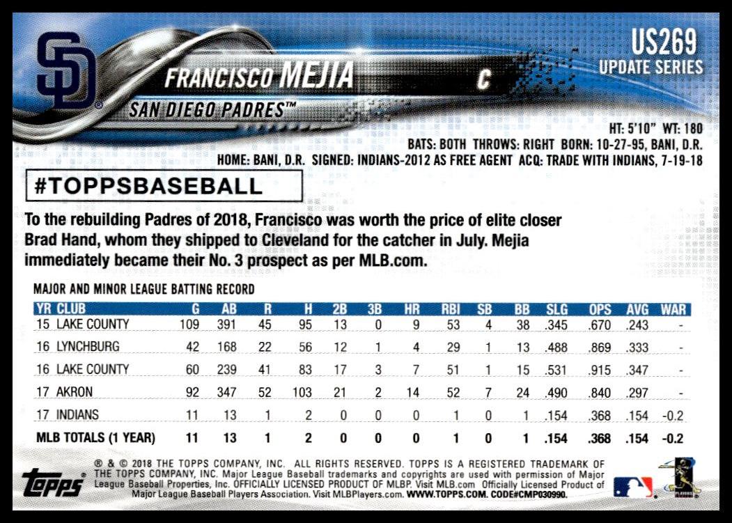 This Baseball card, from 2018 is part of the Topps Update card set. Francisco Mejia is featured and has a card number of US269.