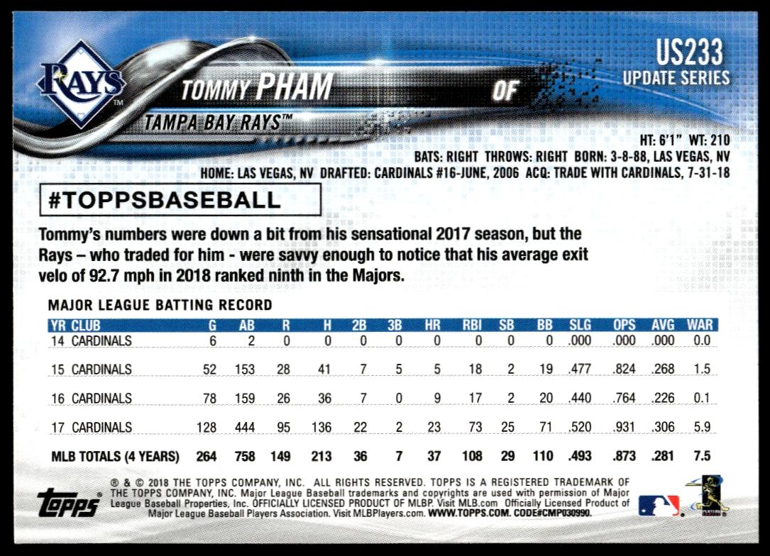 This BaseballΒ card, from 2018 is part of the Topps UpdateΒ card set. Tommy Pham is featured and has a card number of US233.
