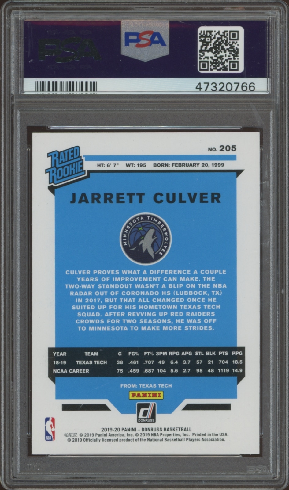 2019-20 Panini Donruss Jarrett Culver #205 in PSA 10 condition, perfect for collectors seeking high-quality basketball memorabilia.