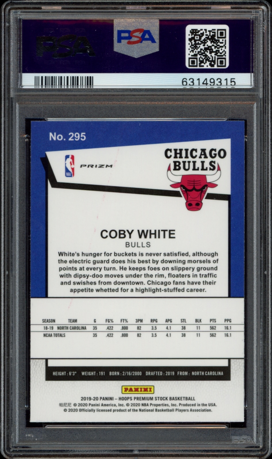 2019-20 Panini NBA Hoops Coby White Pulsar #295, graded PSA 9, a must-have for collectors and fans alike. Enhance your collection today!