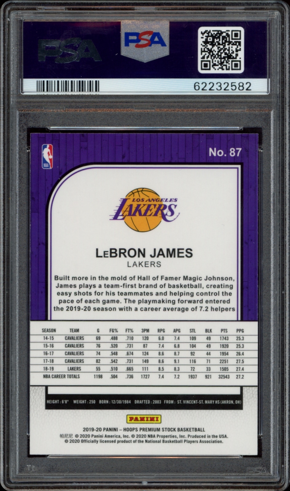 This Basketball card, from 2019-20 is part of the Panini NBA Hoops Premium Stock card set. LeBron James is featured and has a card number of 87. It is graded by PSA and has a numeric grade of 10.