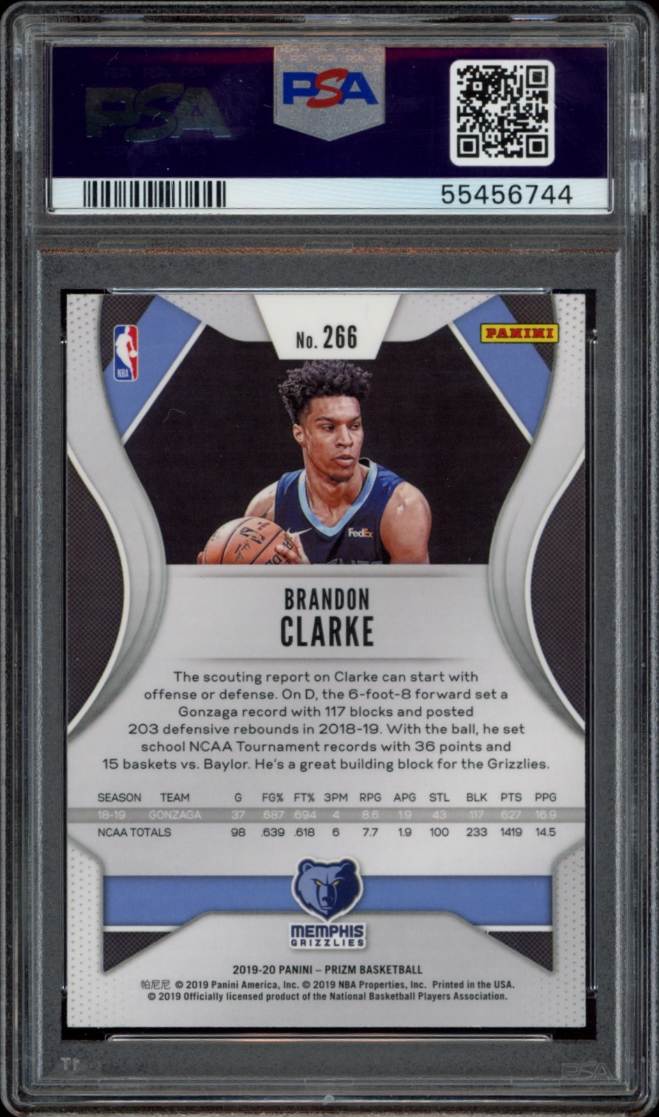 This Basketball card, from 2019-20 is part of the Panini Prizm card set. Brandon Clarke is featured and has a card number of 266. It is graded by PSA and has a numeric grade of 9.