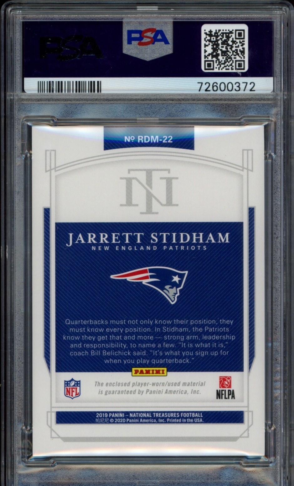 This Football card, from 2019 is part of the Panini National Treasures card set. Jarrett Stidham is featured and has a card number of RDM-22. It is graded by PSA and has a numeric grade of 9.
