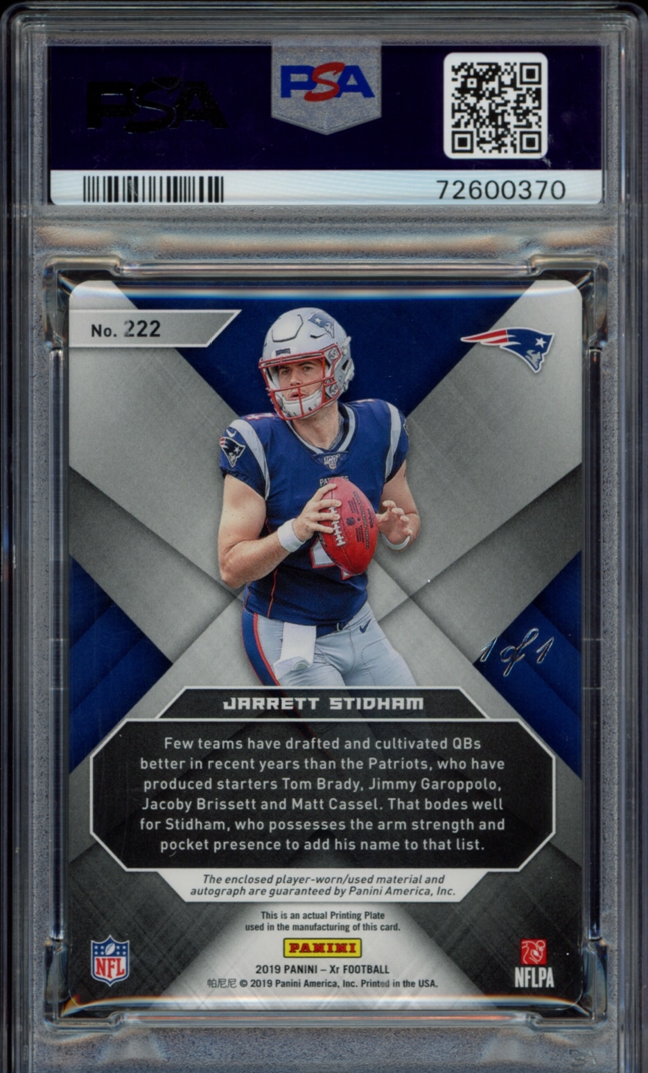 This Football card, from 2019 is part of the Panini XR card set. Jarrett Stidham is featured and has a card number of 222. It is graded by PSA and has a numeric grade of 8.