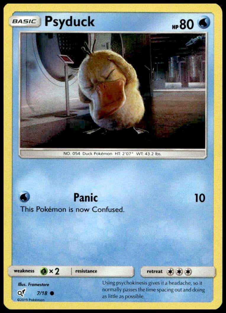 This Pokémon card, from 2019 is part of the Pokémon Detective Pikachu card set. Psyduck is featured and has a card number of 7/18.