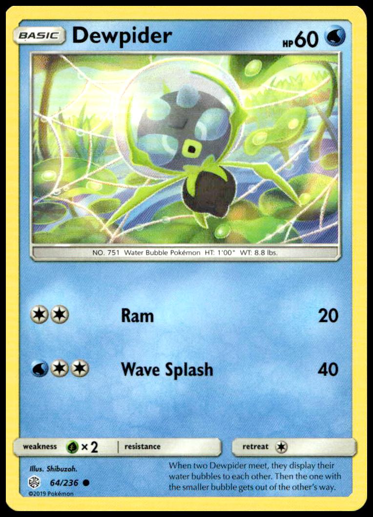 This Pokemon card, from 2019 is part of the Pokémon Sun & Moon – Cosmic Eclipse card set. Dewpider is featured and has a card number of 64/236.
