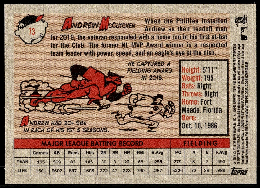 This Baseball card, from 2019 is part of the Topps Archives card set. Andrew McCutchen is featured and has a card number of 73.