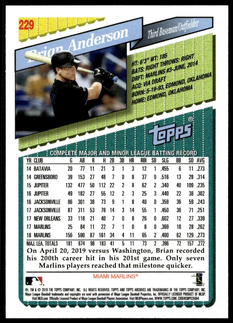 This Baseball card, from 2019 is part of the Topps Archives card set. Brian Anderson is featured and has a card number of 229.