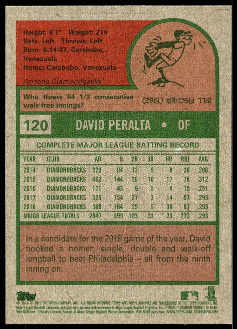 This BaseballΒ card, from 2019 is part of the Topps ArchivesΒ card set. David Peralta is featured and has a card number of 120.