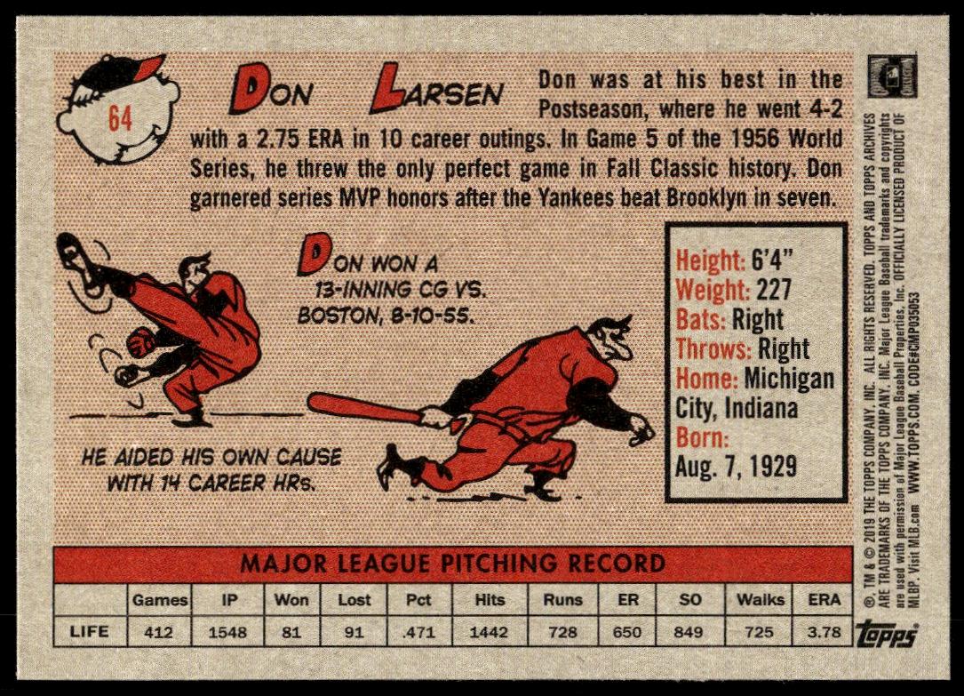 This BaseballΒ card, from 2019 is part of the Topps ArchivesΒ card set. Don Larsen is featured and has a card number of 64.