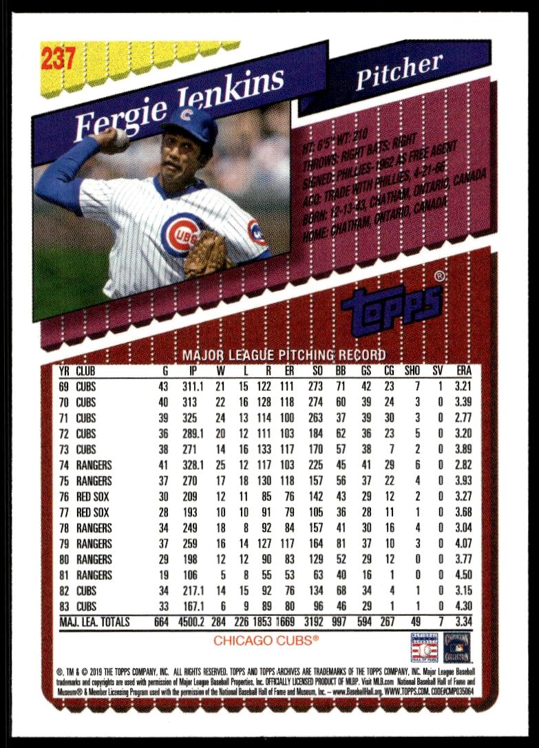This BaseballΒ card, from 2019 is part of the Topps ArchivesΒ card set. Fergie Jenkins is featured and has a card number of 237.