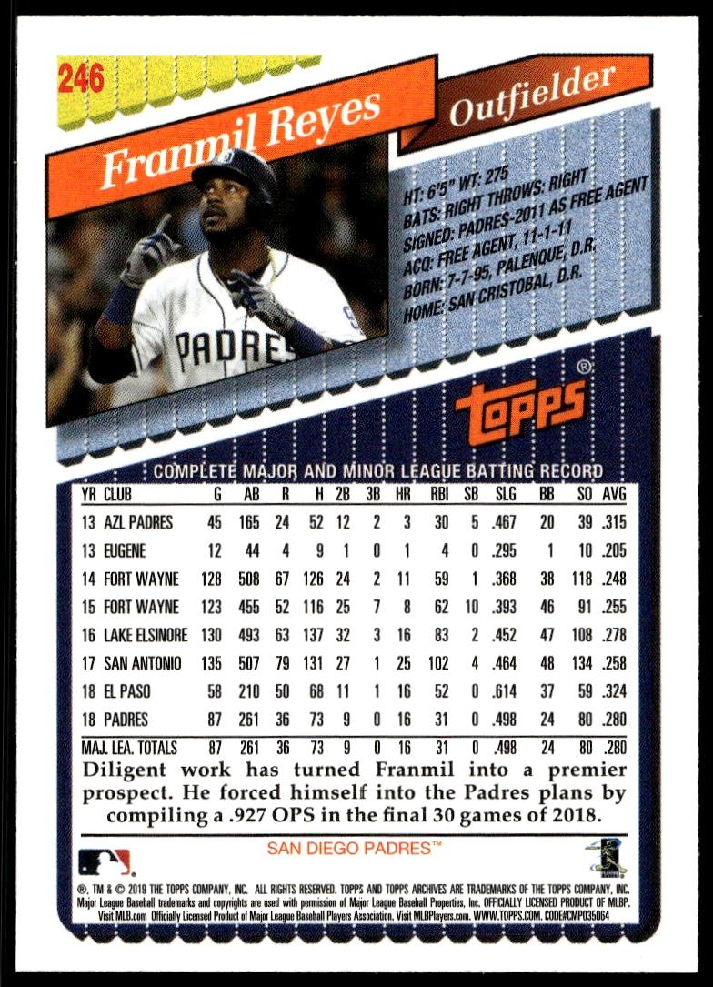 This BaseballΒ card, from 2019 is part of the Topps ArchivesΒ card set. Franmil Reyes is featured and has a card number of 246.