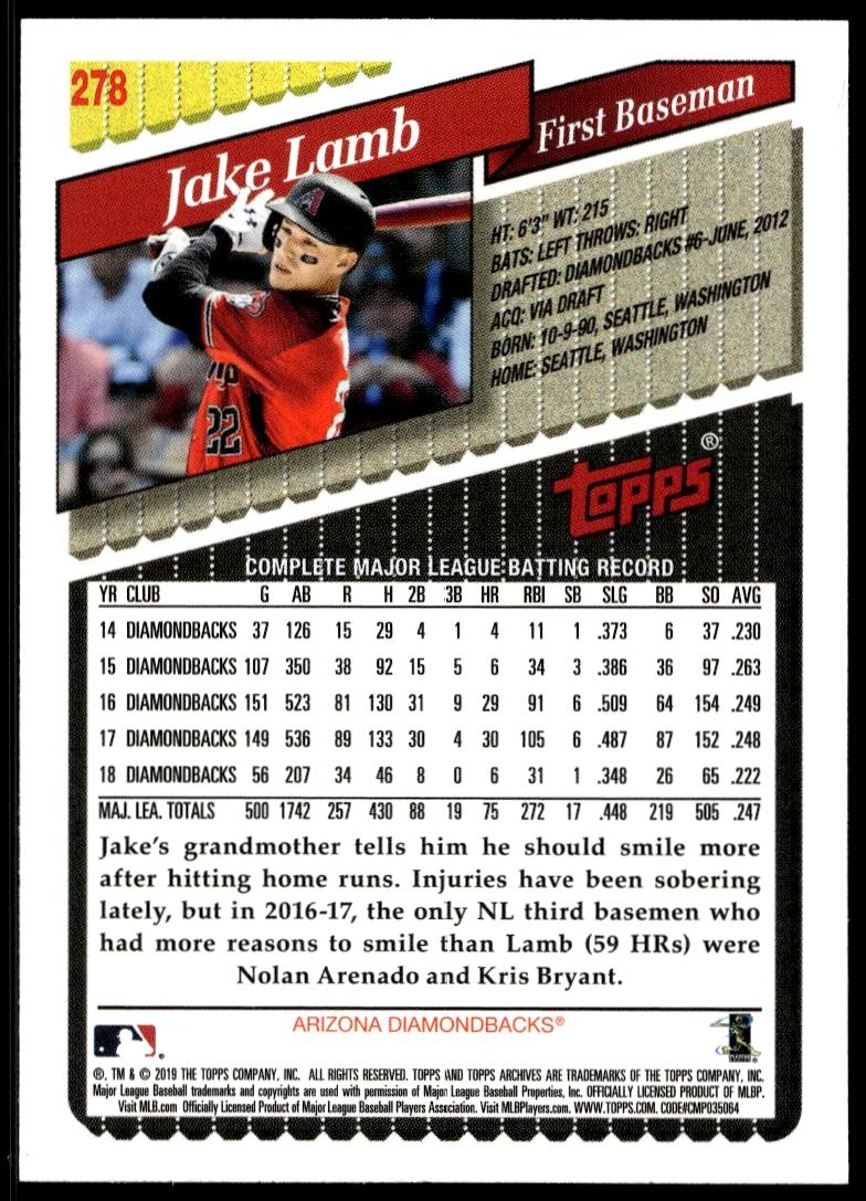 This BaseballΒ card, from 2019 is part of the Topps ArchivesΒ card set. Jake Lamb is featured and has a card number of 278.