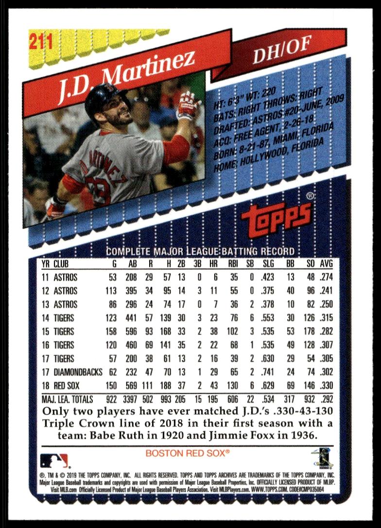 This BaseballΒ card, from 2019 is part of the Topps ArchivesΒ card set. J.D. Martinez is featured and has a card number of 211.