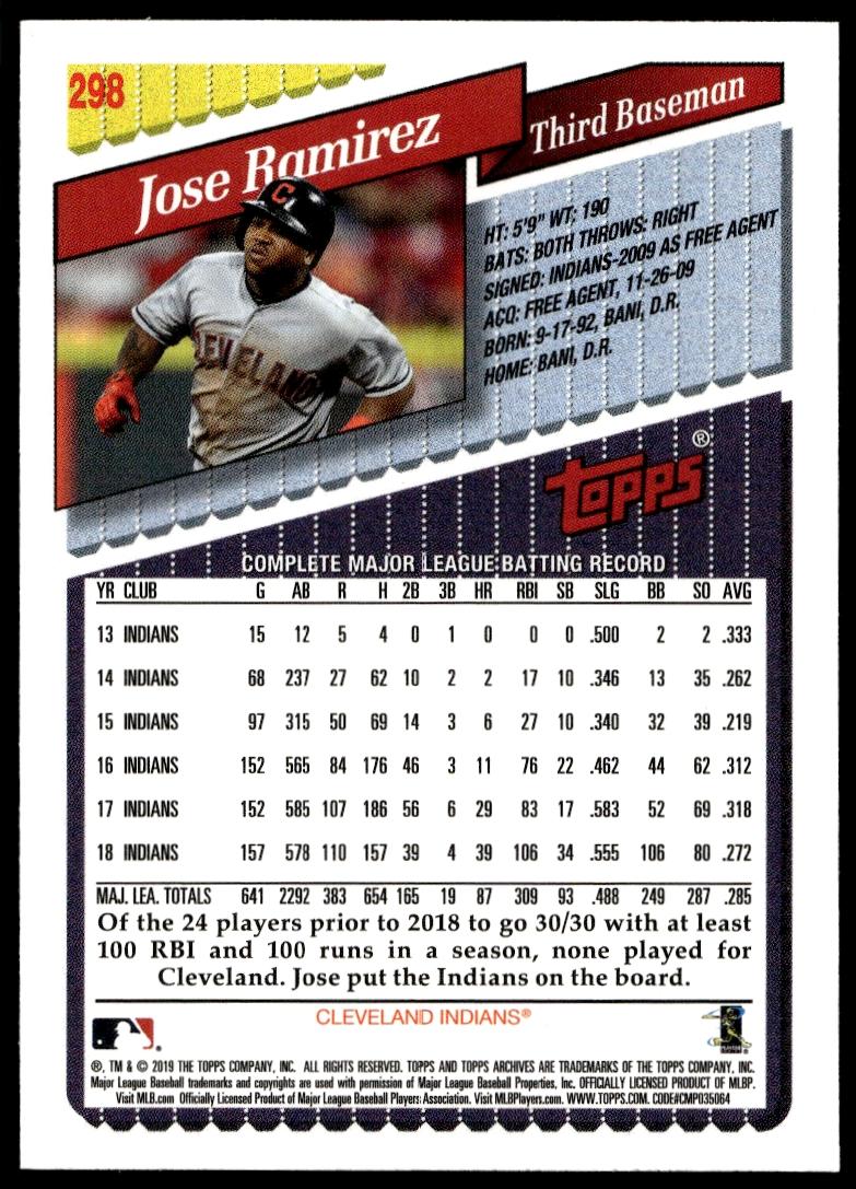 This BaseballΒ card, from 2019 is part of the Topps ArchivesΒ card set. Jose Ramirez is featured and has a card number of 298.
