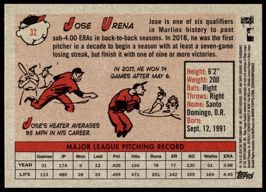 This BaseballΒ card, from 2019 is part of the Topps ArchivesΒ card set. Jose Urena is featured and has a card number of 32.