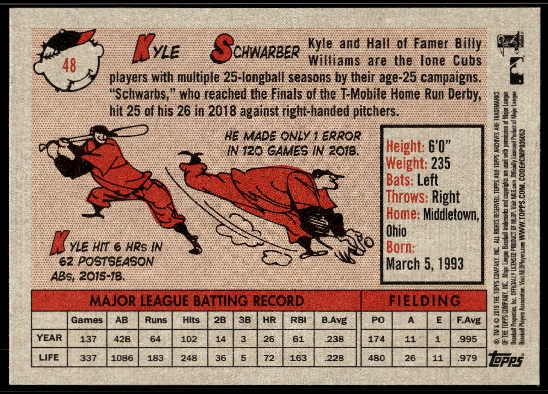 This BaseballΒ card, from 2019 is part of the Topps ArchivesΒ card set. Kyle Schwarber is featured and has a card number of 48.