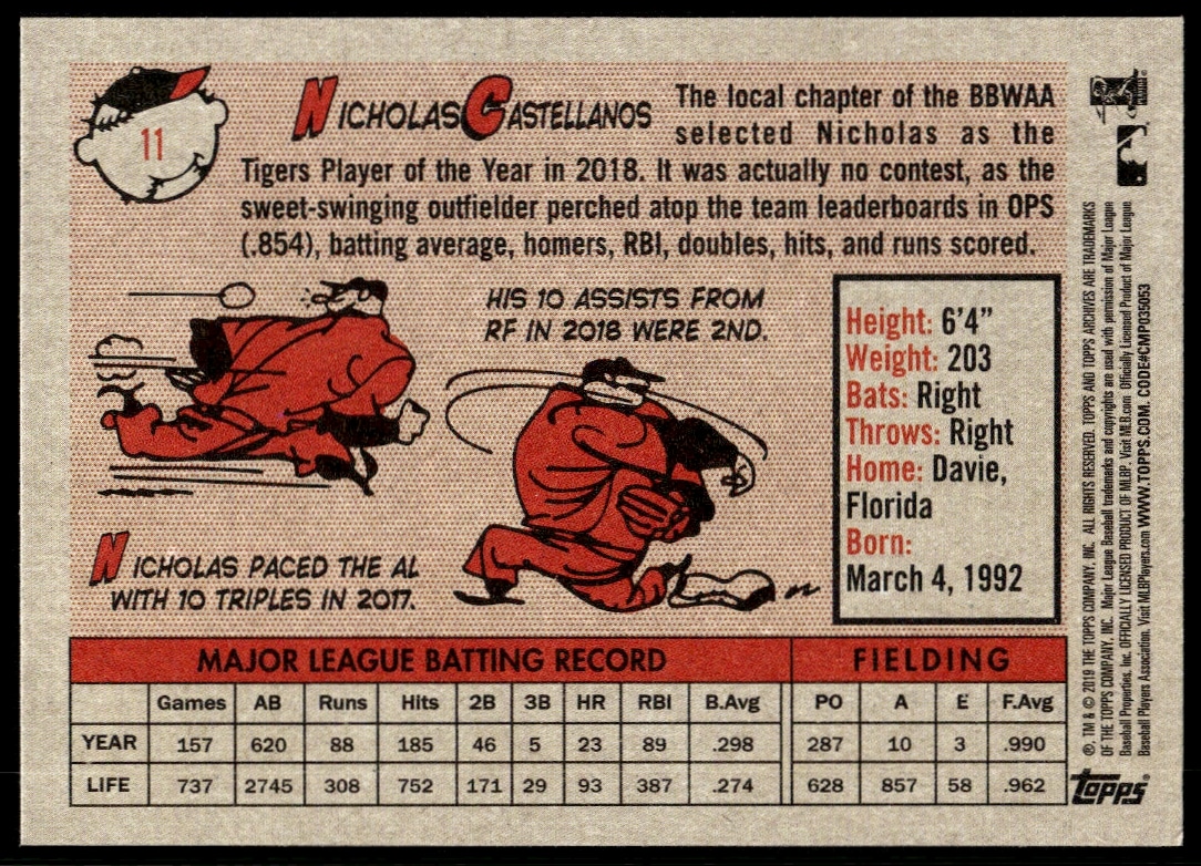 This BaseballΒ card, from 2019 is part of the Topps ArchivesΒ card set. Nicholas Castellanos is featured and has a card number of 11.