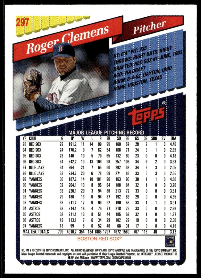 This BaseballΒ card, from 2019 is part of the Topps ArchivesΒ card set. Roger Clemens is featured and has a card number of 297.