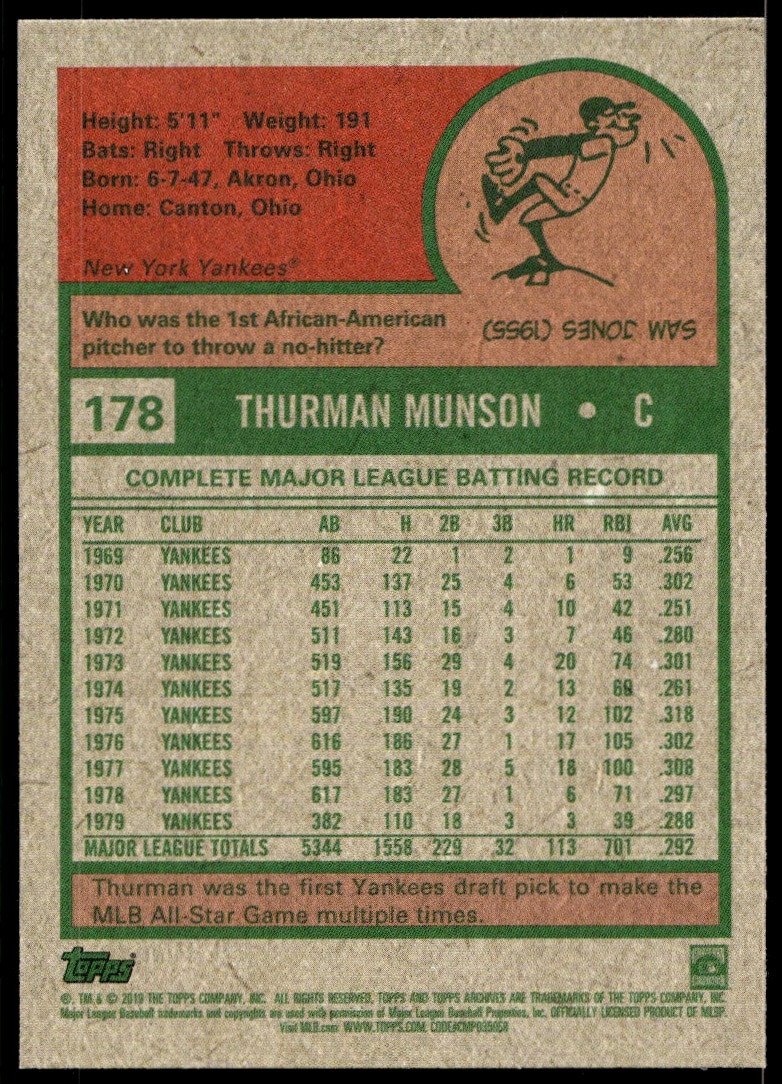 This BaseballΒ card, from 2019 is part of the Topps ArchivesΒ card set. Thurman Munson is featured and has a card number of 178.