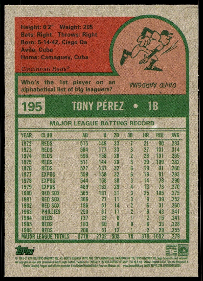 This Baseball card, from 2019 is part of the Topps Archives card set. Tony Pérez is featured and has a card number of 195.