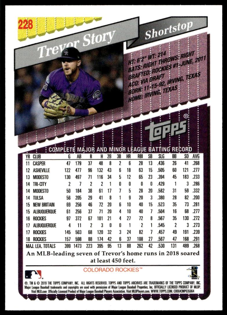 This BaseballΒ card, from 2019 is part of the Topps ArchivesΒ card set. Trevor Story is featured and has a card number of 228.