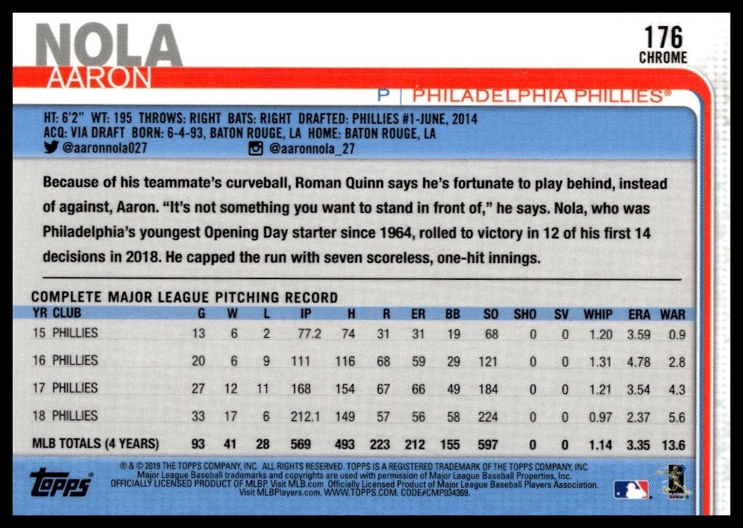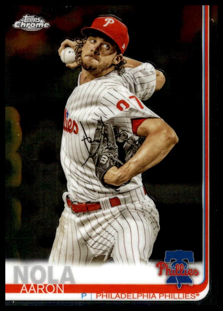 This Baseball card, from 2019 is part of the Topps Chrome card set. Aaron Nola is featured and has a card number of 176.