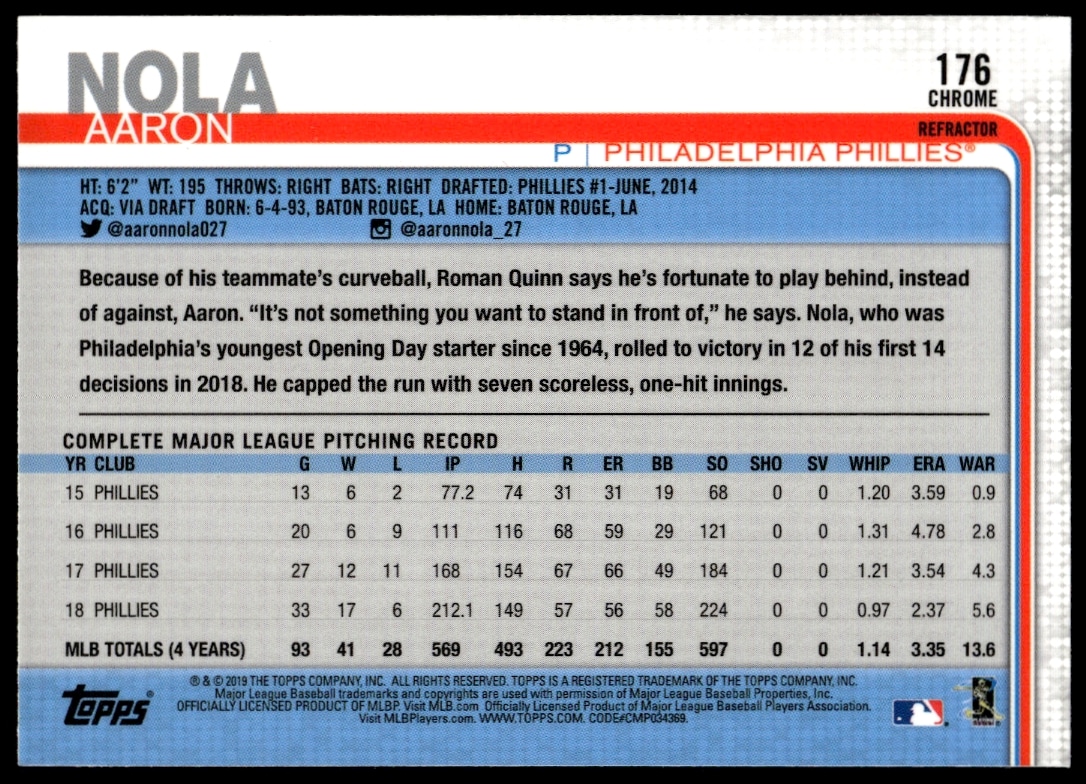 This Baseball card, from 2019 is part of the Topps Chrome card set. Aaron Nola is featured and has a card number of 176.