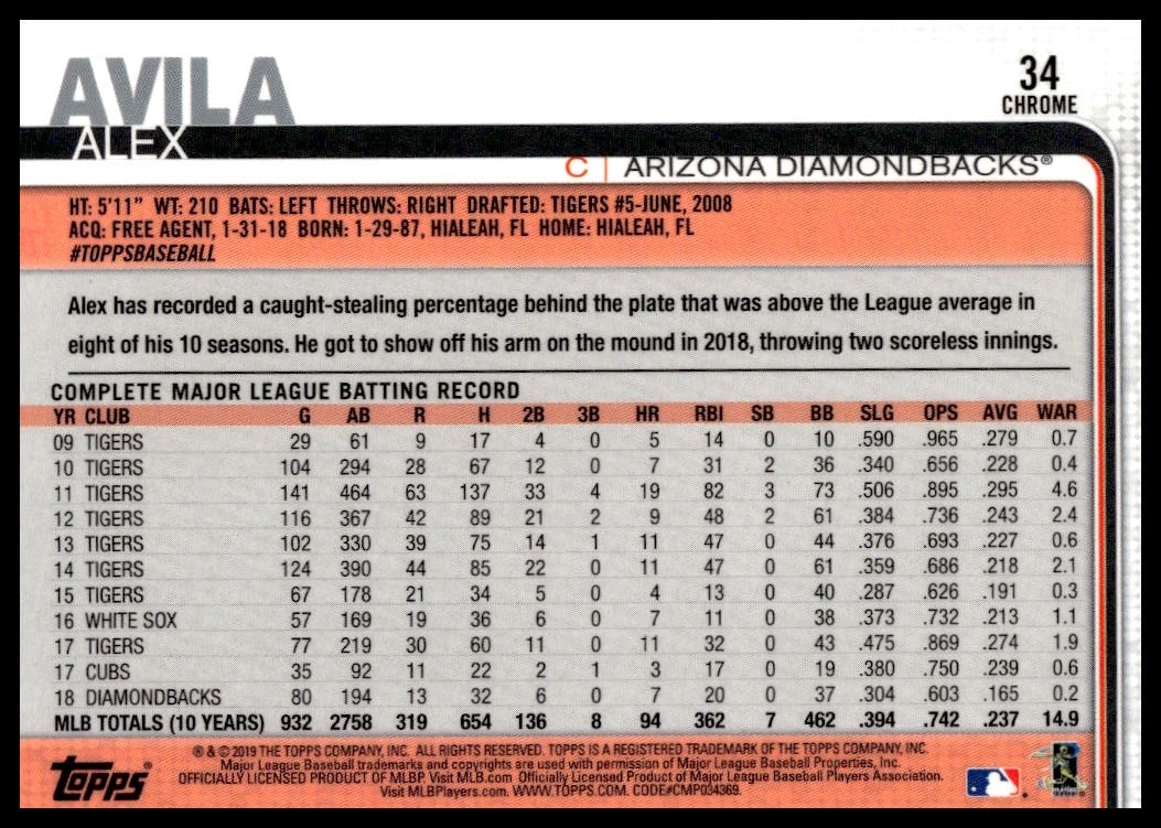 This BaseballΒ card, from 2019 is part of the Topps ChromeΒ card set. Alex Avila is featured and has a card number of 34.