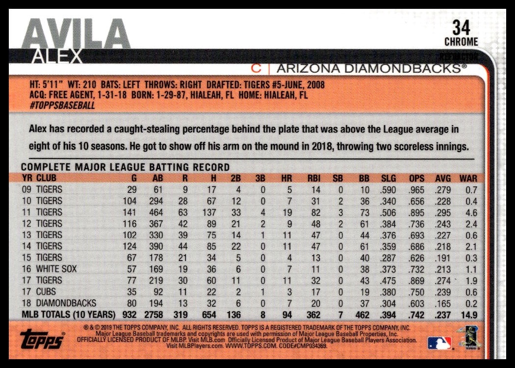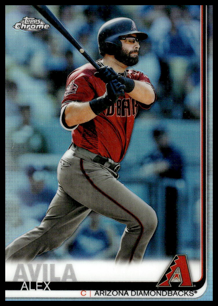 This BaseballΒ card, from 2019 is part of the Topps ChromeΒ card set. Alex Avila is featured and has a card number of 34.