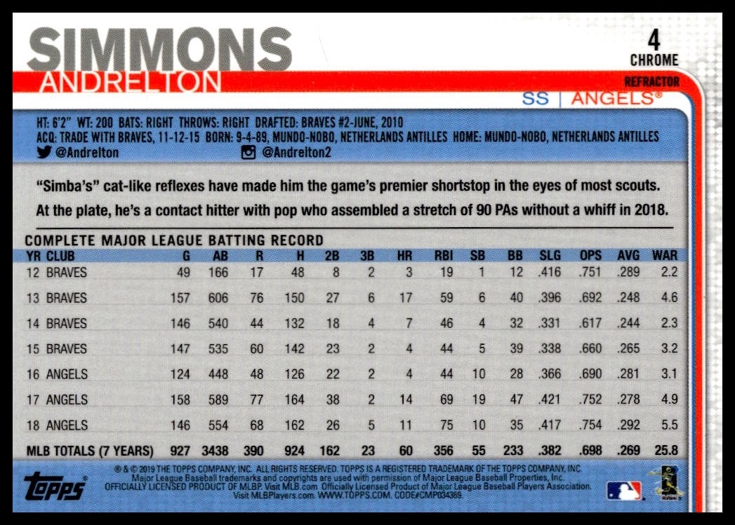 This Baseball card, from 2019 is part of the Topps Chrome card set. Andrelton Simmons is featured and has a card number of 255.