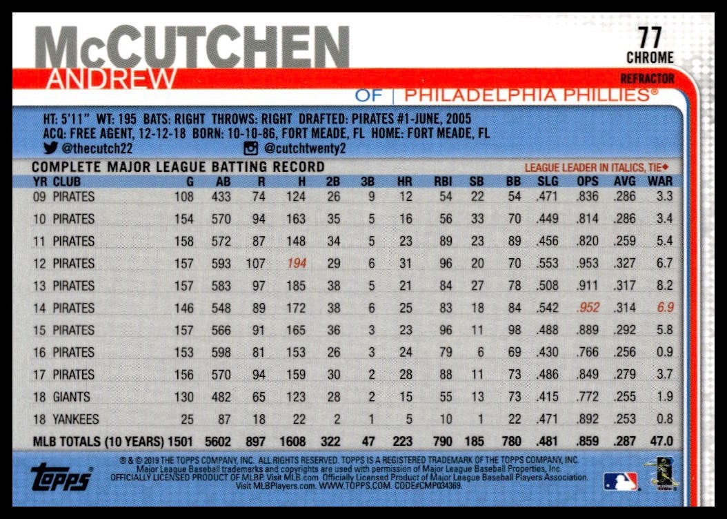 This Baseball card, from 2019 is part of the Topps Chrome card set. Andrew McCutchen is featured and has a card number of 77.