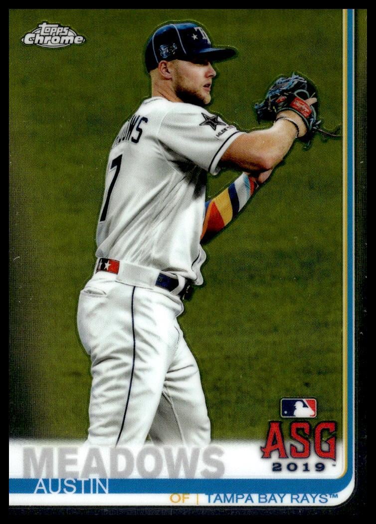 This Baseball card, from 2019 is part of the Topps Chrome card set. Austin Meadows is featured and has a card number of 96.