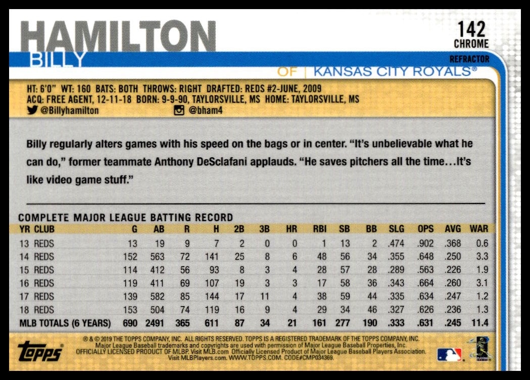 This Baseball card, from 2019 is part of the Topps Chrome card set. Billy Hamilton is featured and has a card number of 142.