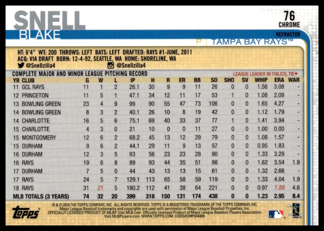 This Baseball card, from 2019 is part of the Topps Chrome card set. Blake Snell is featured and has a card number of 76.