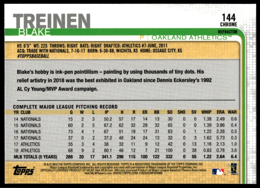 This Baseball card, from 2019 is part of the Topps Chrome card set. Blake Treinen is featured and has a card number of 144.