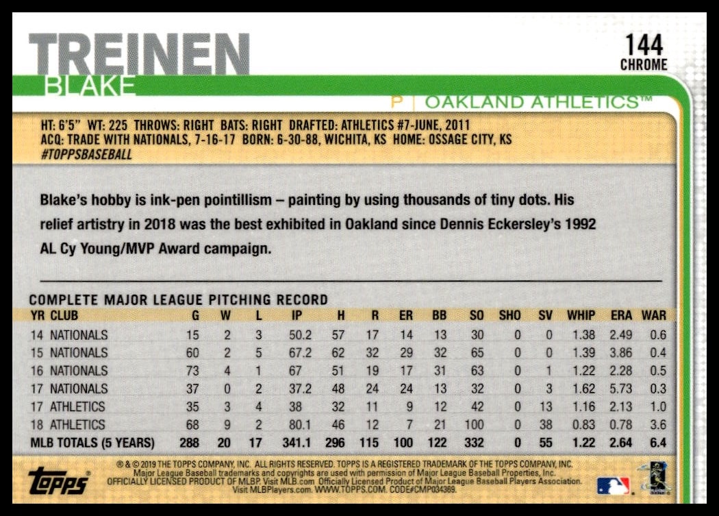 This BaseballΒ card, from 2019 is part of the Topps ChromeΒ card set. Blake Treinen is featured and has a card number of 144.