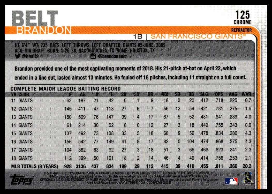 This BaseballΒ card, from 2019 is part of the Topps ChromeΒ card set. Brandon Belt is featured and has a card number of 125.