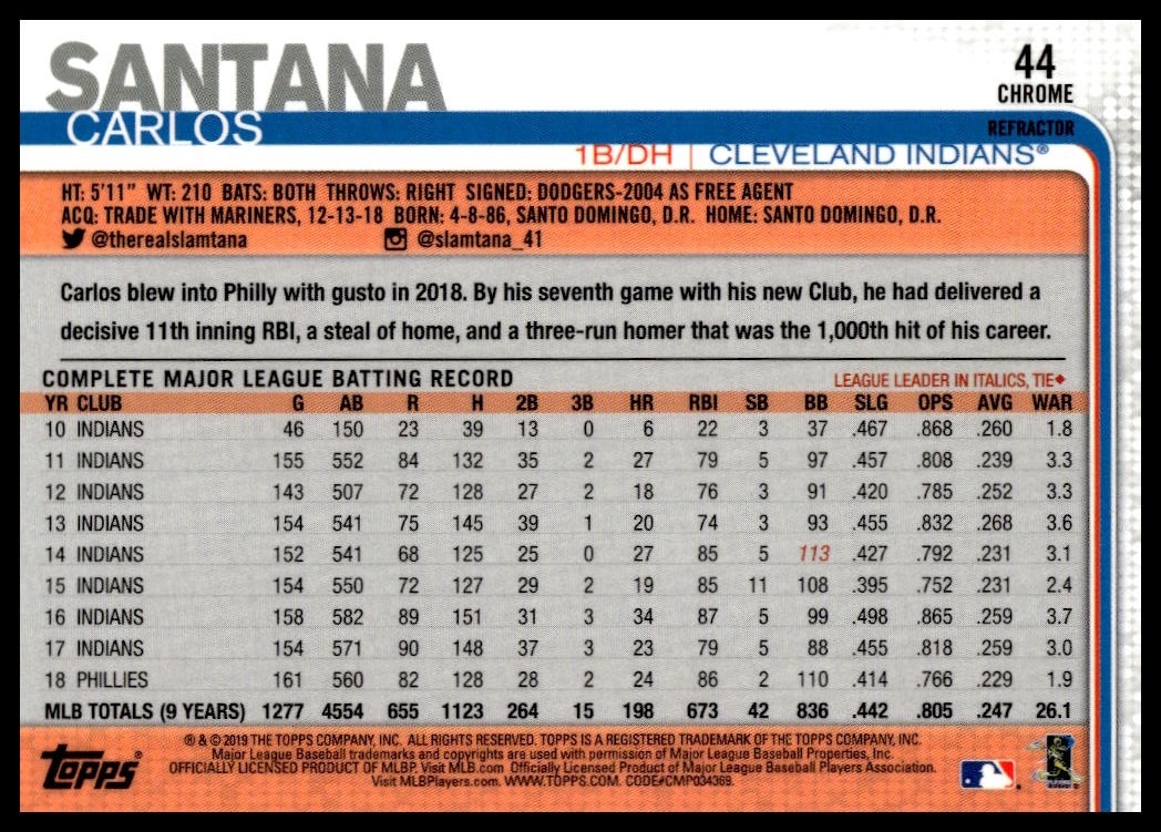 This BaseballΒ card, from 2019 is part of the Topps ChromeΒ card set. Carlos Santana is featured and has a card number of 44.