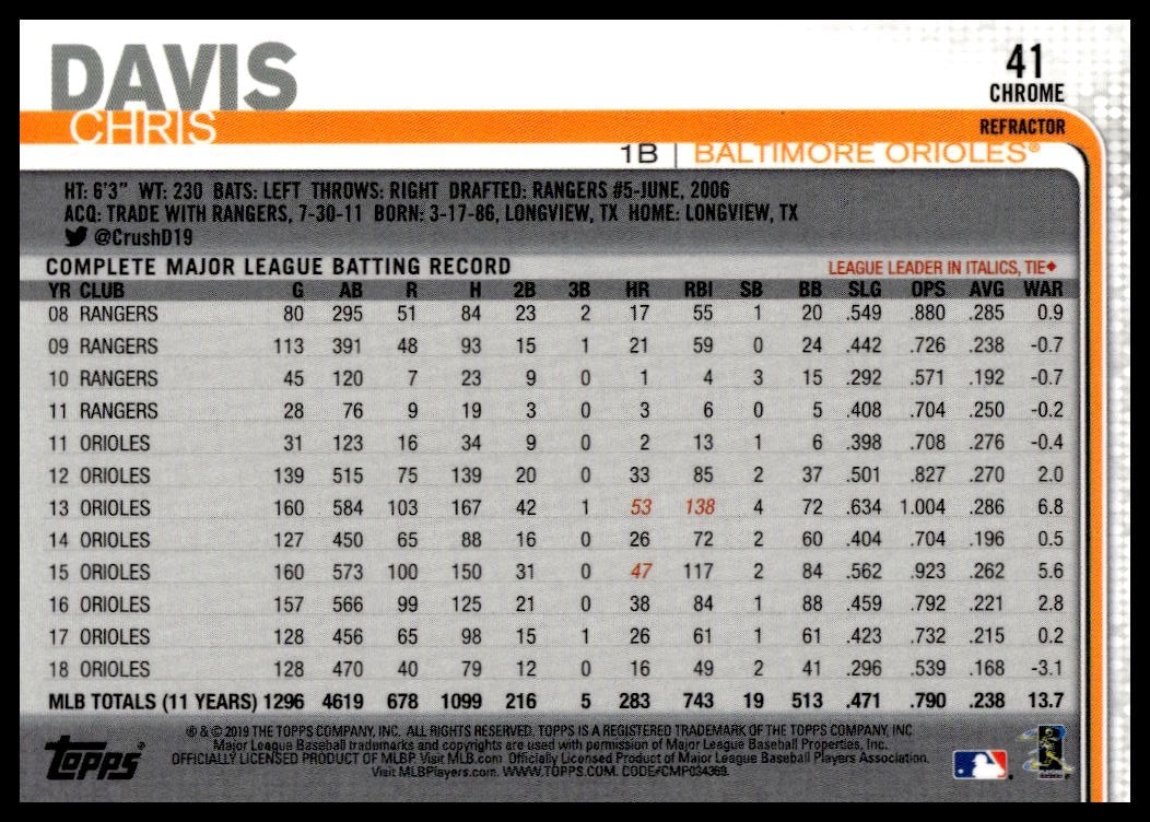 This BaseballΒ card, from 2019 is part of the Topps ChromeΒ card set. Chris Davis is featured and has a card number of 41.