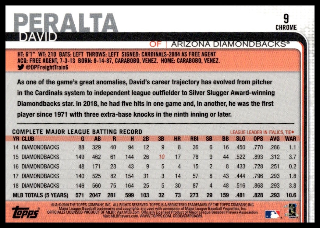 This BaseballΒ card, from 2019 is part of the Topps ChromeΒ card set. David Peralta is featured and has a card number of 9.