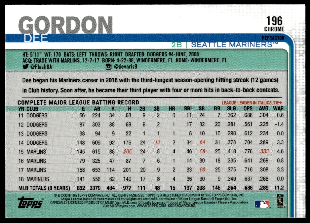 This Baseball card, from 2019 is part of the Topps Chrome card set. Dee Gordon is featured and has a card number of 292.